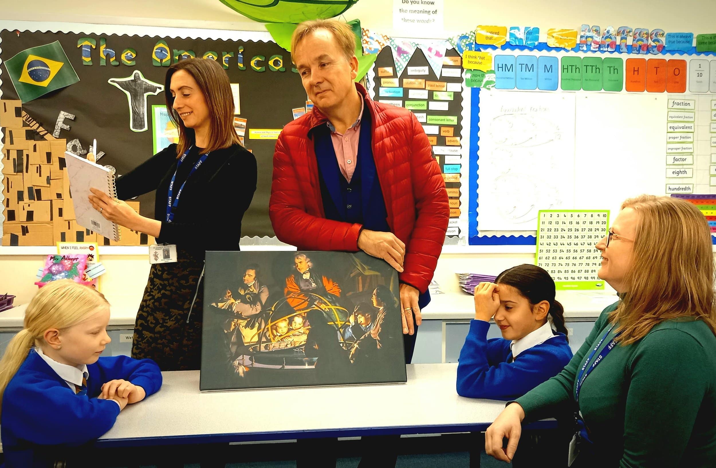 From left St Alban’s Catholic Voluntary Academy School pupil Lauren Muldoon, Peter Ellse, CEO of Cosy Direct, Fiona Muldoon, Upper key stage 2 lead and school pupil Amelia-May Olivier with the school’s copy of Joseph Wright’s A Philosopher Lecturing on the Orrery.