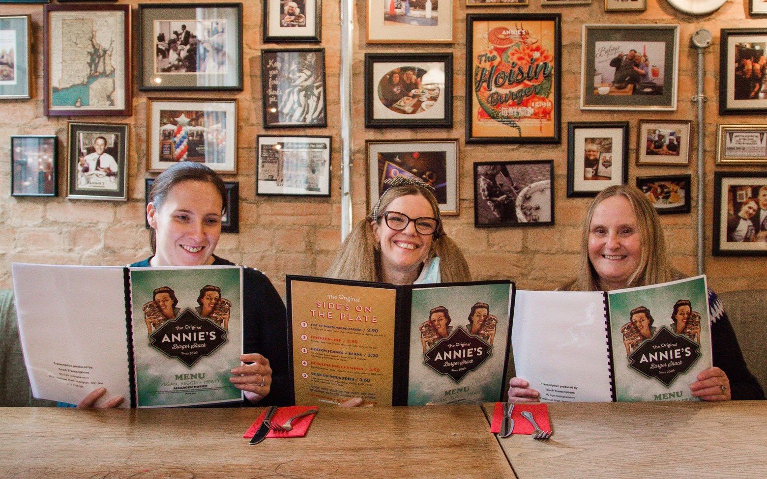 Picture shows: From left, sight loss advisor Donna Keane of charity My Sight Notts, Annie Spaziano, owner of Annie’s Burger Shack and Julie Sarle, communications manager at My Sight Notts, with the restaurant’s new Braille menus.