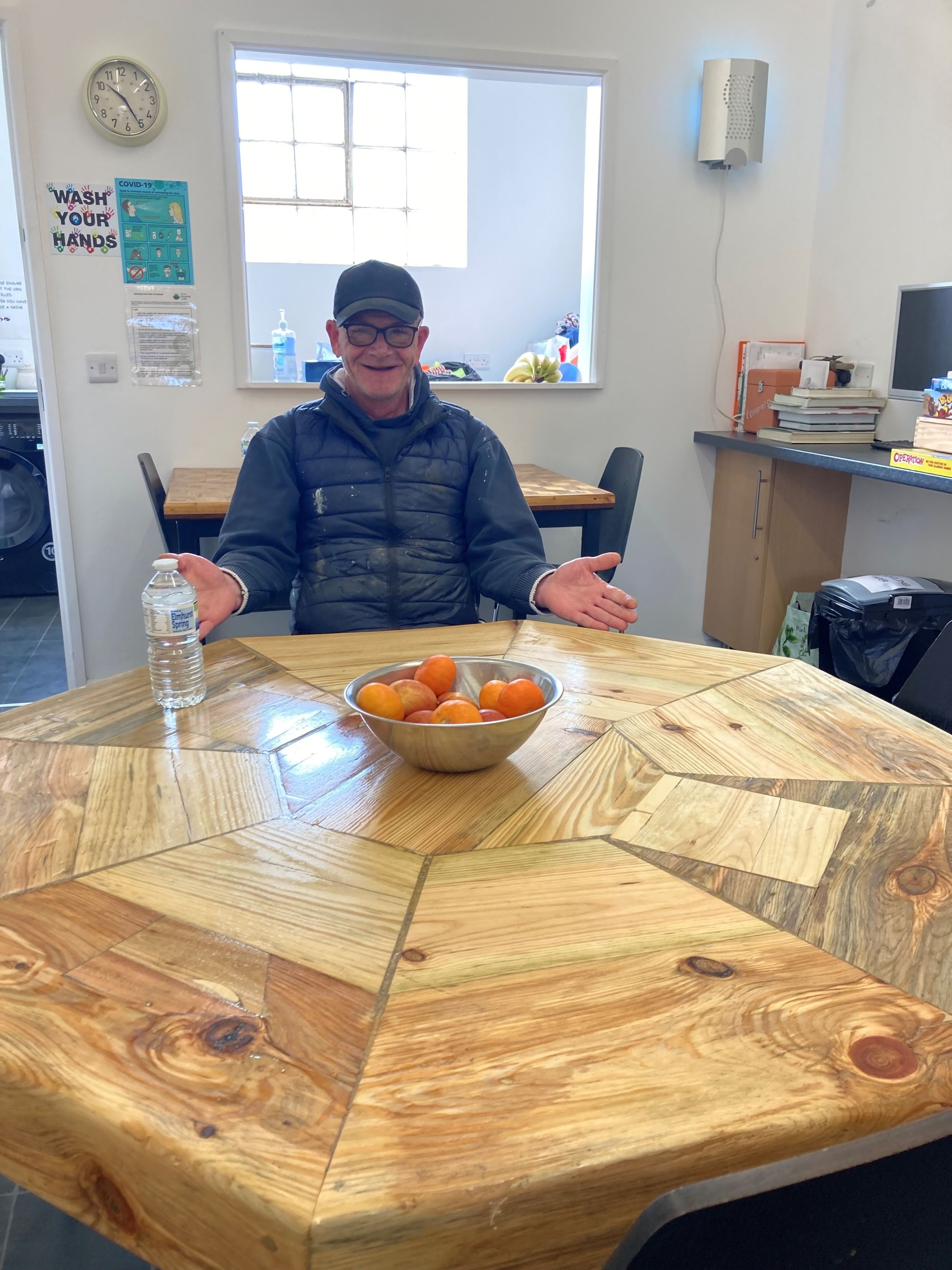 Pictures show: Wayne Rodgers sitting at a table he has made through attending Growing Lives