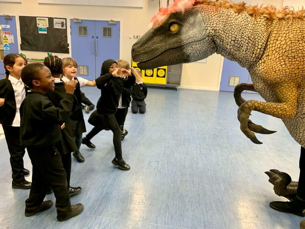 Pupils at a Derby school had a “roarsome” surprise when a group of dinosaurs dropped in for a fun-filled prehistoric show.