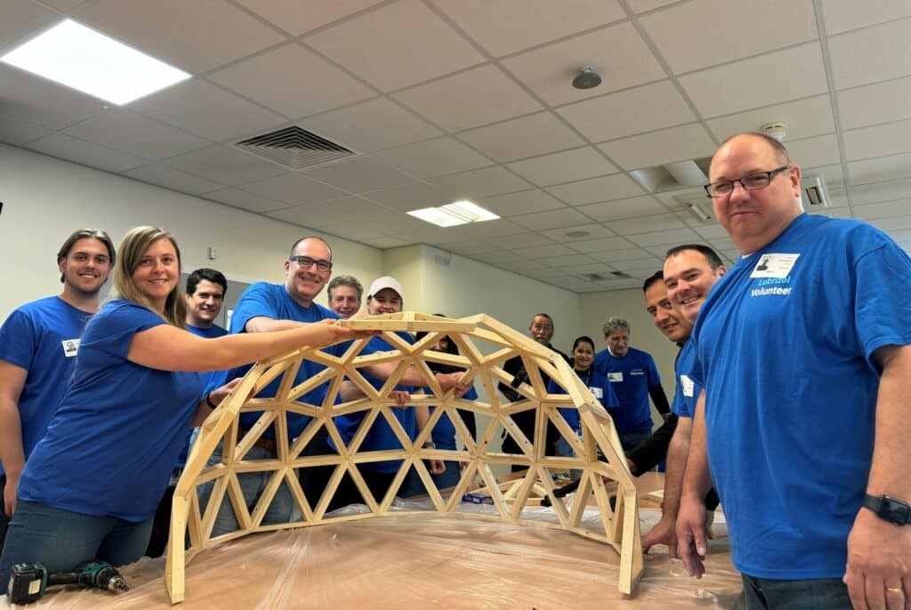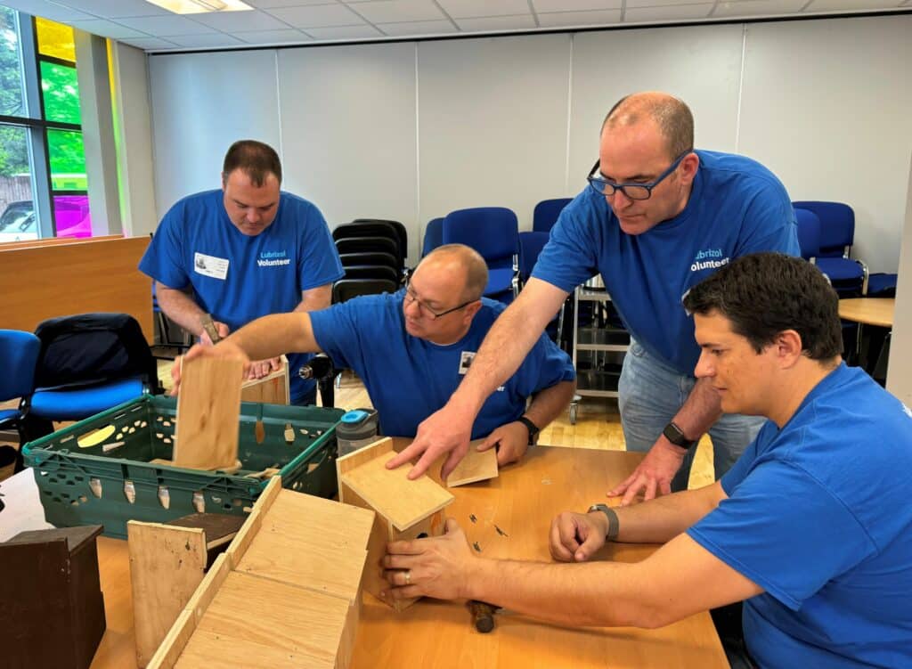Procurement directors from science company Lubrizol who are based in the USA, China, South Africa, France and the UK were at the YMCA’s base on Derby where they got stuck in to help with planting, painting and making bird boxes – as well as constructing a geodesic dome.