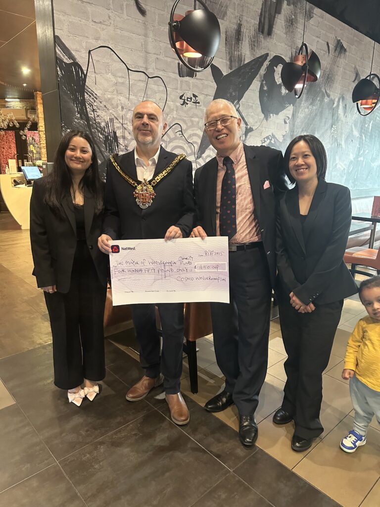 COSMO Wolverhampton, an all-you-can-eat world banqueting restaurant located in Bentley Bridge Retail Park, marked its 15th birthday by holding a charity event that raised £450 each for three deserving causes — The Mayor of Wolverhampton’s Charitable Fund, Wednesfield in Bloom and The Staffordshire Regiment Association.