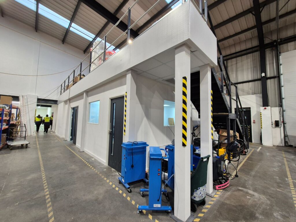 A full height fire-rated compartment wall with steel encasement was installed to enclose the newly constructed first-floor office block. This space houses a boardroom, open-plan breakout area and modern welfare facilities, providing a high-quality working environment that encourages collaboration while allowing room for future expansion.