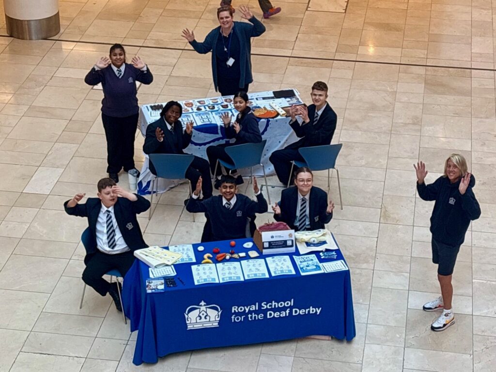 The “BSL tour” included visits to the University of Derby and Derbion, where pupils spent time with members of the public teaching basic BSL, handing out information sheets and stickers, and encouraging people to consider learning more.