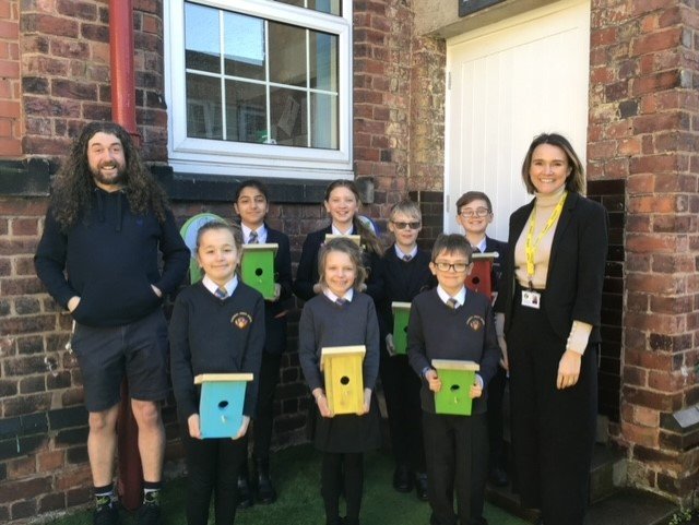Photo shows: Cavendish Junior School caretaker, Lee Turner (left) with Interim head teacher Rebecca Freaston (right) and students, holding their bird boxes
