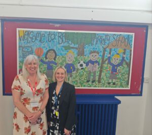 Head teacher of Beaufort Primary School, Kate Beecroft, welcomes Derby North MP Amanda Solloway to the school.